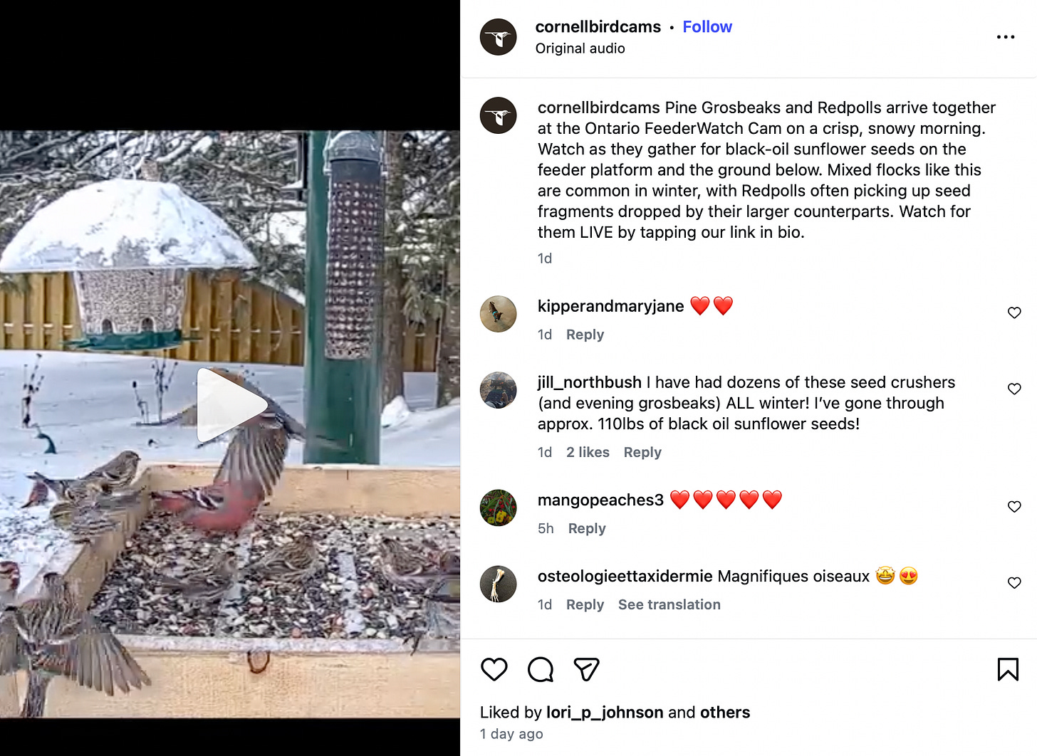 Cornell Live Bird Cam - Pine Grosbeaks and Redpolls arrive together at the Ontario FeederWatch Cam.
